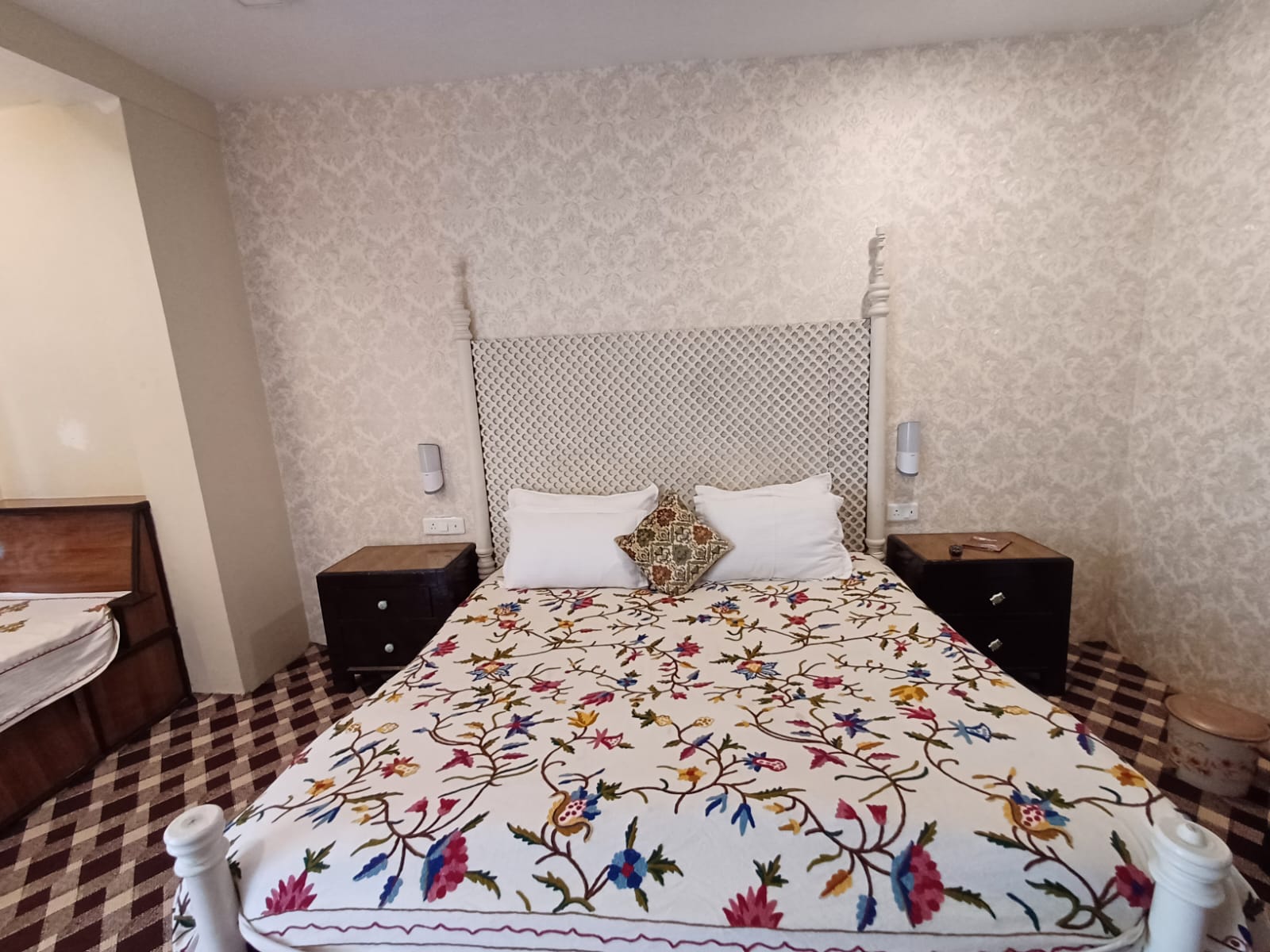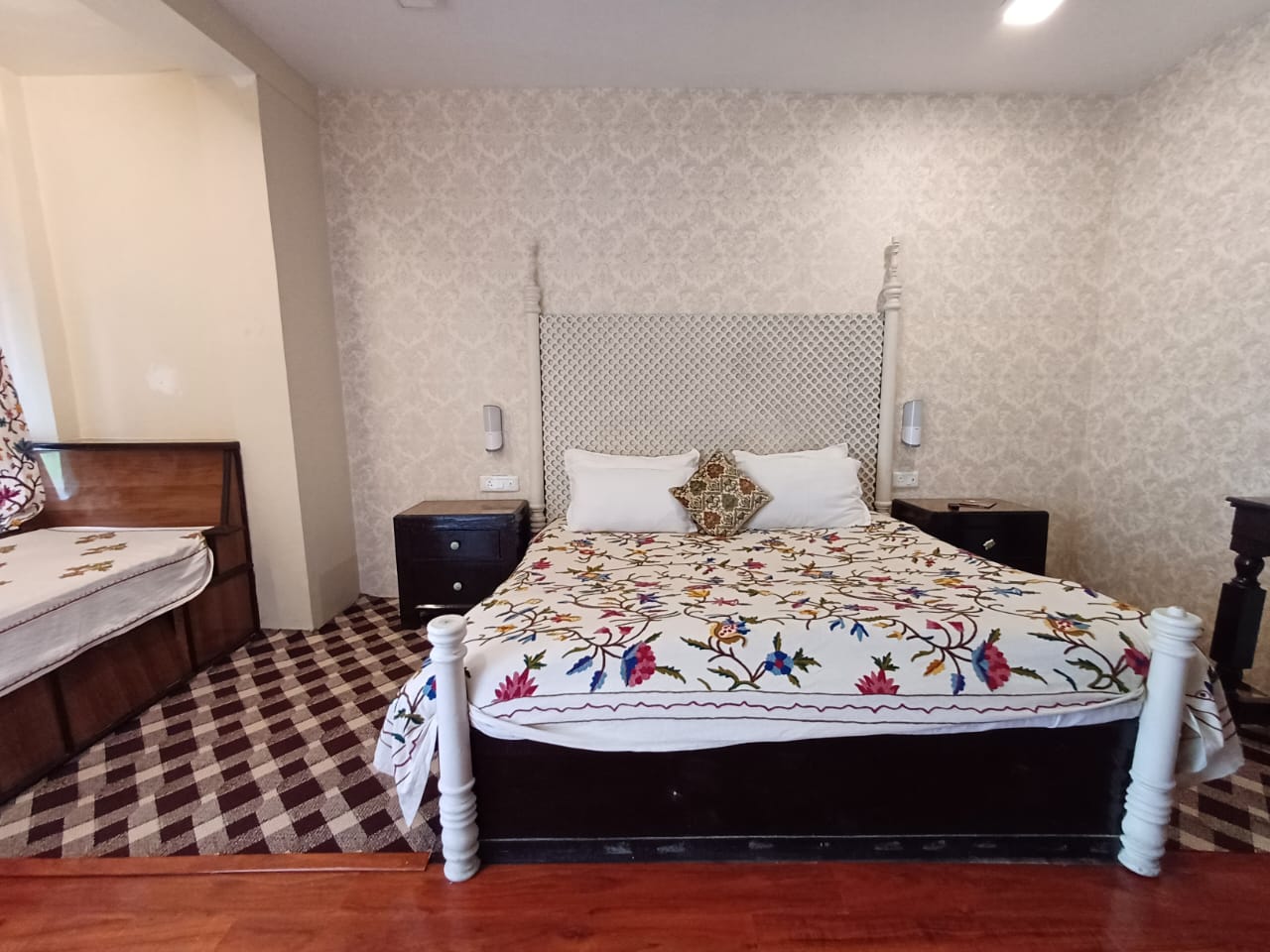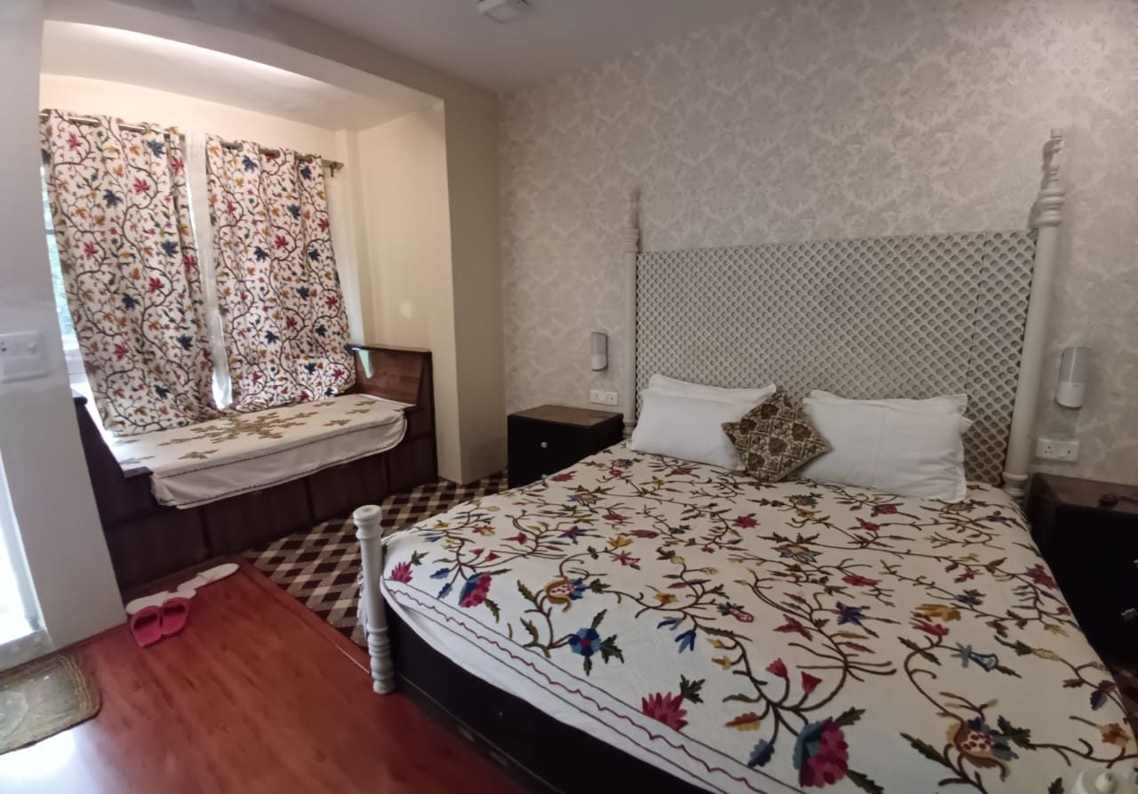 Maanasbal is in the middle of the 3 rooms facing the garden. It is a cozy deluxe, double bed room on the ground floor located on the north wing of the property. This room enjoys a private verandah over looking the garden. Maanasbal is a large room with the dimensions of 14.5 by 12 feet , with a dressing area of 7 by 4 feet next to the bathroom (8 by 9 feet).